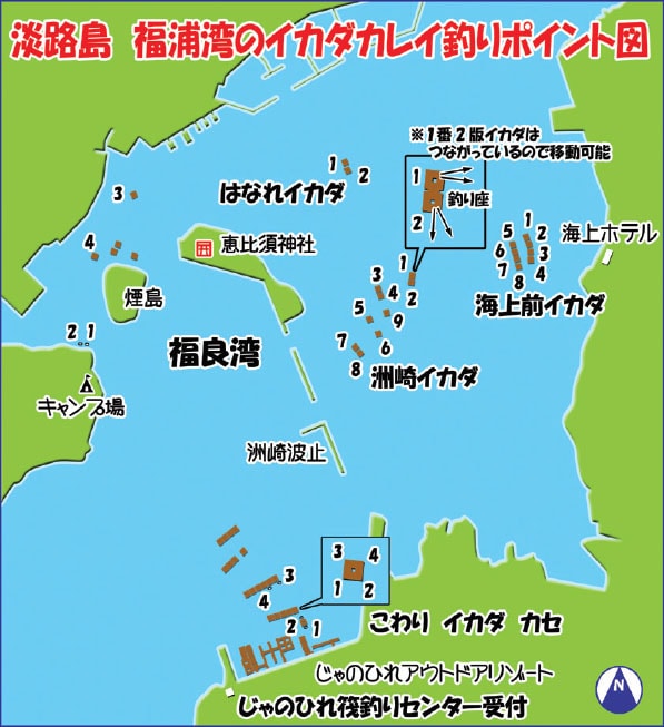 ポイント図。イカダから東面中心にサオを4本出して、中・近投そして足元と仕掛けを入れカレイからのシグナルを待つ。