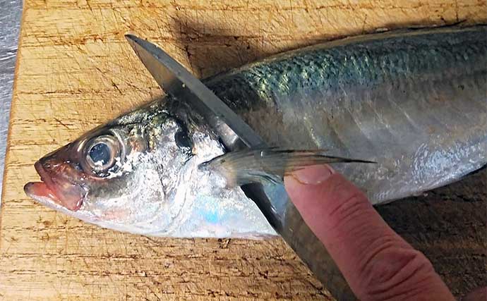 持ち帰ったマルアジは頭を落とし、エラとワタとって下処理。あとは内側(腹側)をよく水洗いすれば下処理は完了。
