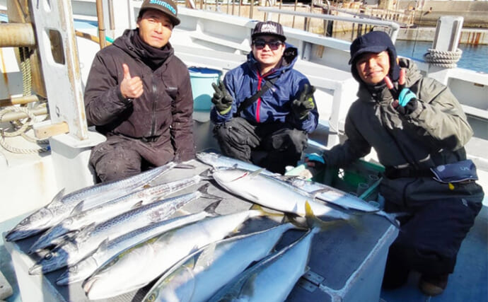 愛知県・南知多町師崎の第十二まとばや丸では28日強風吹き付ける天気となったが、風裏ポイントでじっくり青物狙い。朝イチからアタリ頻発。バラしながらも着実に数を重ね、良型のサワラやワラサを中心に青物が好調にヒット。お土産十分の好釣果となりやや早上がりで帰港。