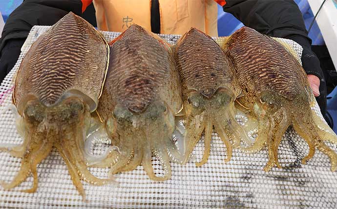 愛知県西尾市寺部港の釣り船レンタルショップキャプテンズでは23日、冬の味覚コウイカを狙ったお客さんからの釣果。むっちりとした肉厚で甘みのあるおいしい人気ターゲット。繊細なアタリと乗ったときのズッシリ感が楽しいコウイカはこれからがシーズン。