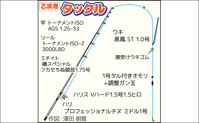 乙浜港タックル例(提供:週刊つりニュース関東版APC・澤田朝寛)近くにはトイレが完備されているので、子どもや女性にも安心。釣行の帰りには国道127号の館山バイパスにあるとしまや弁当・館山店の「チャーシュー弁当」がお勧め。秘伝のタレを使った伝統の味で非常に美味しい。