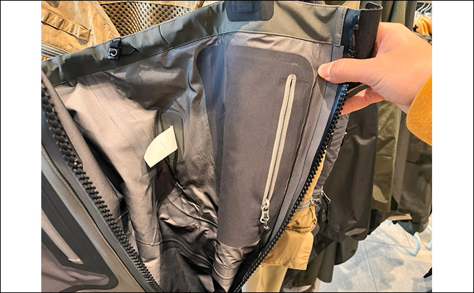 フロントファスナーで着脱ラクラク(提供:TSURINEWS編集部・河野)ポケットも多く配置されており、収納力もバッチリ。ウェーダーの内側にもストレッチ素材のポケットが配置されており、濡らしたくないアイテムを入れることができる。