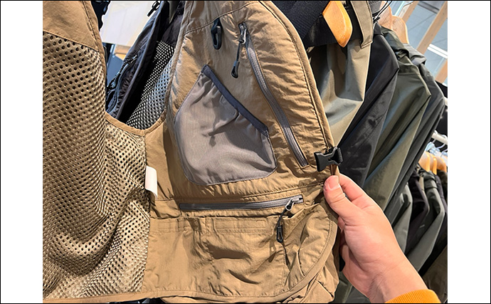 フロント部の大きなポケットが特徴(提供:TSURINEWS編集部・河野)注目したいのは、フロントにある大きな2つのポケット。フライフィッシングで使用する小物もすっぽりと入れることが可能。その他にも脇の下のベンチレーションや、口元の通気口など、細部の設計にもこだわっている。