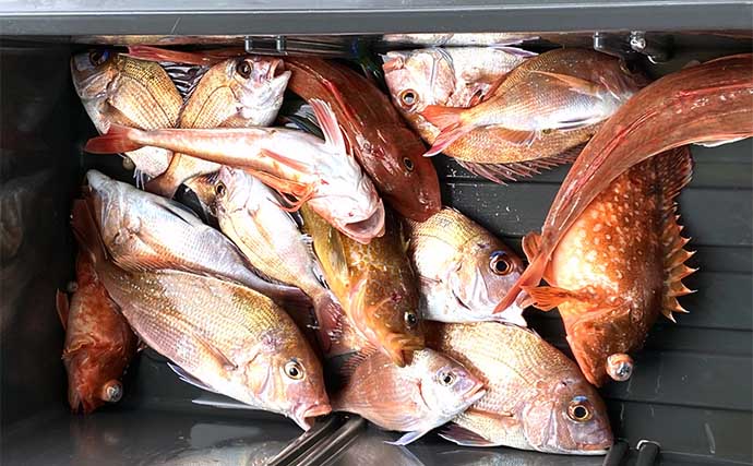 鳥羽沖のタイラバが絶好調だ。三重県伊勢市にある神社港出船の如意丸では、2日にタイラバでマダイ25〜40cmが1人2〜3匹、ホウボウやキジハタなどが上がった。またスぺシャルゲストのカンダイも上がった。1日にはジギングでブリ83〜87cm3匹が上がったほか、サワラ88cmや30〜40cm級のマダイも上がった。