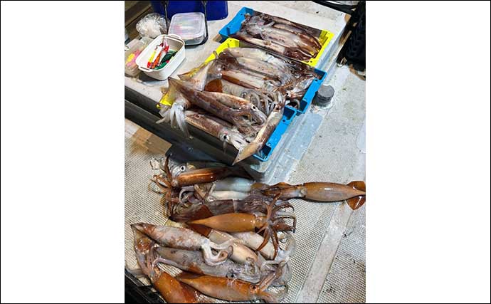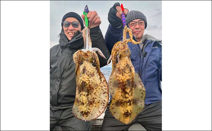 三重県・南伊勢町の神津佐から出船している名古丸では、3日にティップランでキロアップのアオリイカが続々と浮上。サオ頭は5匹キャッチ。ラストにはダブルヒットもあり、キロアップをダブルキャッチとなった。同船では近海ジギングやタイラバ、アマダイ釣りなどでも出船中。