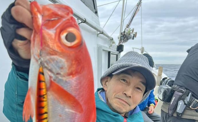 メガキンメ狙いの新島沖ジギングに挑戦【静岡・下田】フックサイズ変更で本命キンメダイ手中やや小ぶりながらうれしい1匹(提供:週刊つりニュース中部版APC・山本憲史)