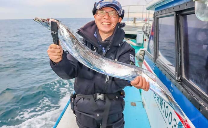 ハイペースで数を伸ばす平野さん(提供:週刊つりニュース関東版・菅野順也)日立市・根本雅透さんは、「引きがダイレクトに伝わるので、タチウオのジギングが気に入っています。食べても美味いので最高ですね」と、1尾追加。