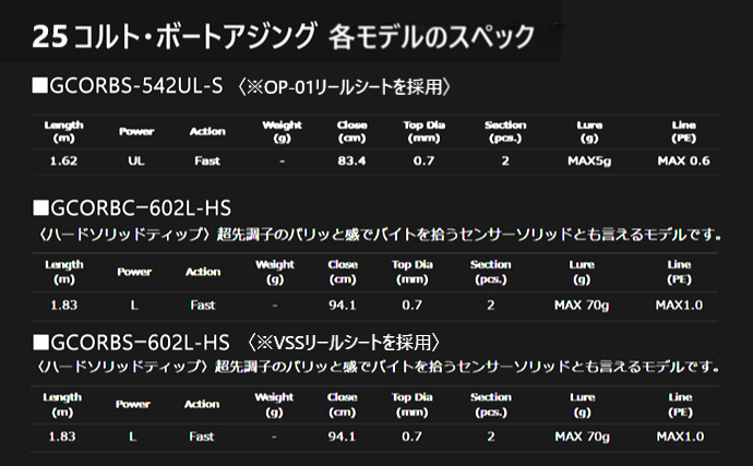 25コルト・ボートアジングモデル(提供:オリムピック)いずれのモデルもコルトの系譜である「高感度」はもちろん、「掛ける」「粘る」を高次元で実現。