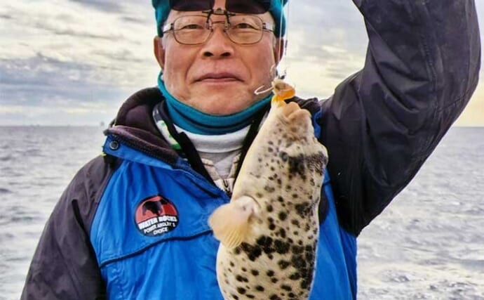 当日の釣果(提供:週刊つりニュース中部版APC・山本嘉弘)一気に引き抜いたのは、ジャンボウマヅラハギだった。フグではなかったが、35cmはありそうだ。