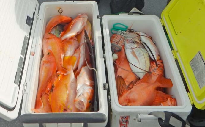 釣果は、アカイサキは1人平均10尾にチカメキントキは15尾、アマダイ1尾、ヤズが1尾、イサキは66尾であった。