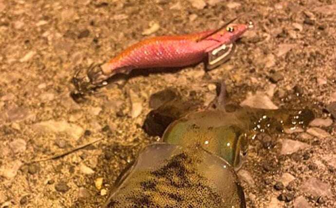 開始早々にヒット(提供:週刊つりニュース西部版APC・徳永拓馬)スレないようにカラーを替え(エギ王Kプチプチコーラル3号490グロー)、すぐさま3投目をより沖へキャストして誘ってくると底の方で違和感があった。アワせると連続ヒット。エギのローテーションがマッチしたのかうれしい2尾目。