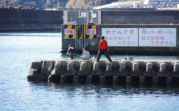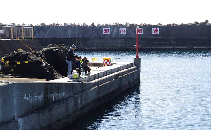 平日は10時ごろまで漁業作業をしているが、それ以降は空いていることが多く竿を出しやすい。正面方向に根があるようで、アオリイカの実績あり。チョイ投げではピンギスやメゴチも。右側は船の係留ロープがあるので真ん中から左側が有望。