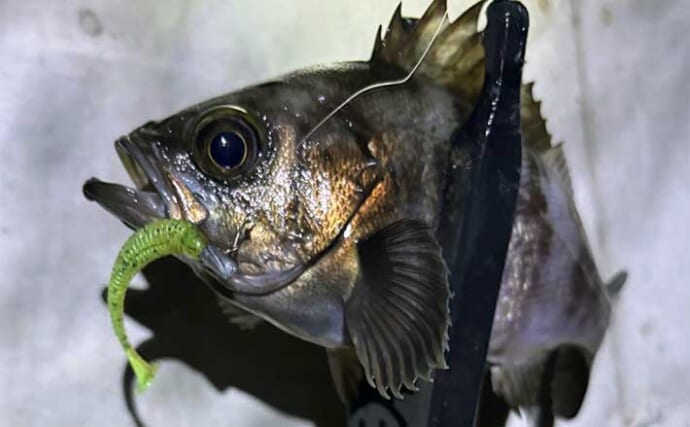 常吉リグは海でも常吉(提供:TSURINEWSライター井上海生)カサゴやメバルは、海底近くで生活しているため、ワームが底付近で揺れる動きに強く反応する。バス用のダウンショットリグを使用すれば、これらのターゲットに効果的にアピールできる。マスバリにワームをちょんがけしてフリーに泳がせることで、魚の本能を刺激し食いつきを引き出すことができる。