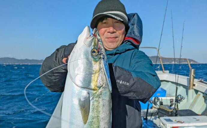 「ええ反応出とるよ!」とアナウンスされた直後、ボトムから速巻きしてストップを入れた瞬間、ゴツンとヒット。船中ファーストヒットはまさかの私だ。ゴリゴリ巻いてくると、浮いたのはブリ……ではなく少し小さめのワラサだった。
