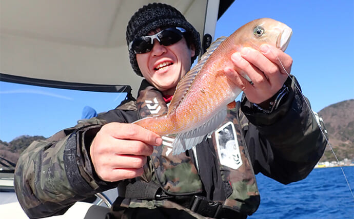 イトヨリダイをキャッチ(提供:TSURINEWSライター・藤倉聡)その後ボートは1ノット近いスピードで流され、オモリを60号から80号にチェンジした。しかし、全く釣れる気配がないので、昼頃に思い切って我入道からポイントを移動することにした。