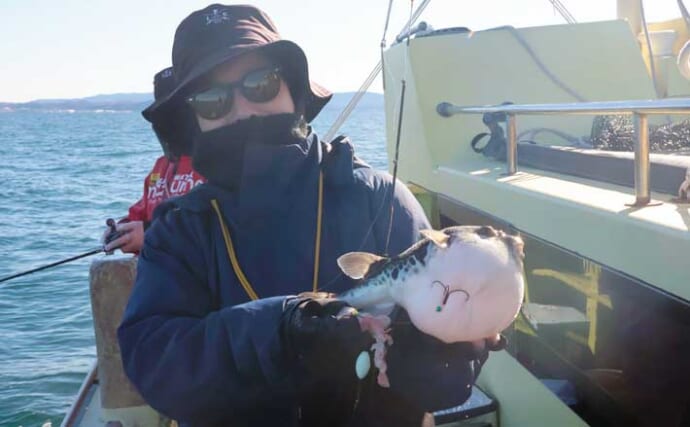 こちらもヒット(提供:週刊つりニュース関東版 岩下)同舷トモ寄りには、同宿へ4年ほど通っている女性ペアが入る。藤原朋江さん(川崎市)に、この日トラフグが初浮上。その隣の戸田陽子さん(鶴見区)も良型ショウサイフグをキャッチ。いずれも1本バリでゲット。