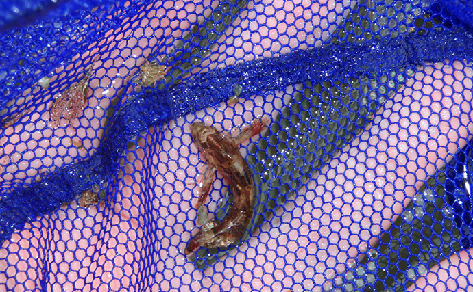 網で掬ってハオコゼが入っていた場合は、網の袋の部分を海に戻し、片手にプラケースなどの容器をもって、水ごと掬ってあげると刺されずにバケツに移すことができます。