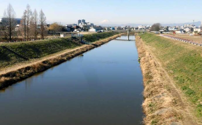 上手橋方向(提供:週刊へらニュースAPC・若松恵治)両岸とも護岸されているので釣り台を持参すればどこでも竿が出せるが、車で釣行の際は駐車スペースの関係で東大久保橋から下流がメインになる。もちろん釣り自体は上流部でもできるのだが、東大久保橋から上流は、最上流のオンドマリの一部にしか車が置けなくなってしまったので気をつけていただきたい。