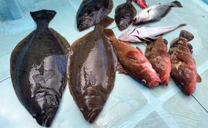 愛知県・南知多町師崎の武丸では、23日イワシの泳がせ釣りで伊良湖沖へ出船。65cmのマッチョなヒラメを筆頭に肉厚の良型が好調にヒット。45cmアップのキジハタが連発し、ニベやマゴチも交じって好釣果となった。