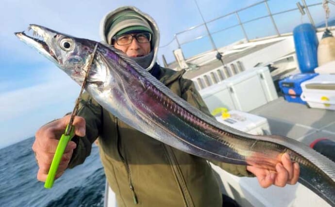 2月25日、大分県大分市・西細港の照陽がタチウオ釣りで大分沖へ出船。朝イチは反応薄い状況でのスタートだったが食い気が上がってくると良型タチウオやドラゴン級がヒット。うれしいラッシュの時間帯もありメンバーらは型数揃えて好釣果に恵まれた。船長は「終盤戦で釣果に個人差ありますがドラゴンチャレンジャー募集中です!」と話している。