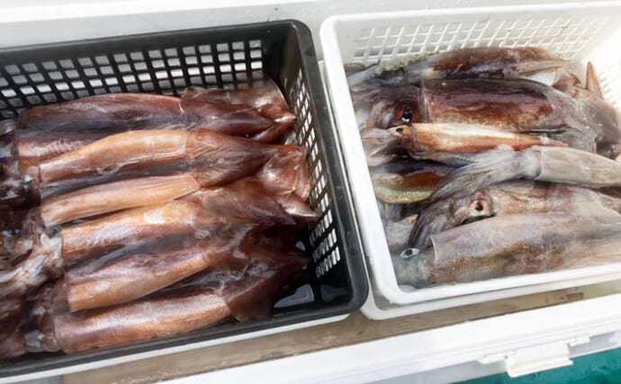 船上では電動リールを巻き上げる音があちこちから聞こえ、序盤からイカもアングラーもノリノリの高活性だ。9時ごろには雪も止み時折晴れ間も覗く。8時間の釣行中、ほぼコンスタントにアタリがあり、忙しく賑やかな釣行となった。