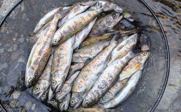 納得の釣果(提供:週刊つりニュース中部版APC・川鴉・石橋英之)釣果は15〜18cmのヒレピン5匹(2匹キープ)、放流物を34匹。今後の状況だが、近年解禁日にはヒレピンの顔を見なかったものの、今年はかなり期待できそうだ。