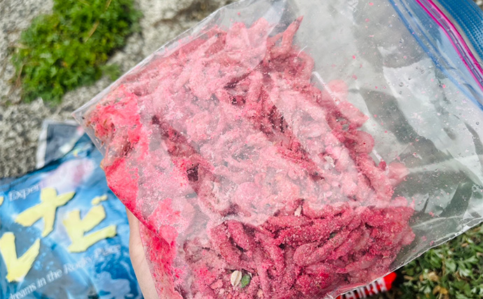 使用したコマセ(提供:TSURINEWSライター・藤本みどり)付けエサもこの2つの集魚剤をまぶしたものを使用。クロの食い気が渋いときなど、しっかりアピールしてくれるのでおすすめですよ!