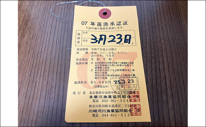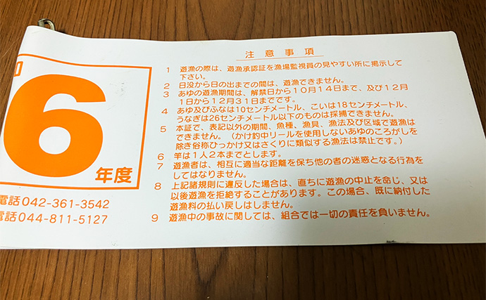 【渓流釣り入門者必見!】遊漁券が必要なワケとは? 購入方法・値段・違反リスクも紹介多摩川の年券(提供:TSURINEWS編集部・藤田)