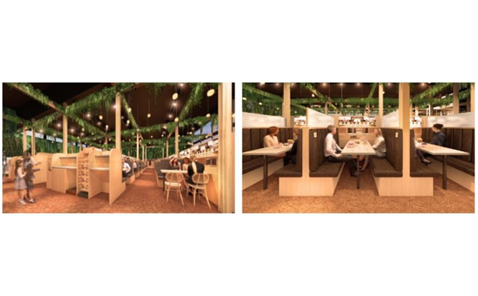 スシロー未来型万博店は、会場の中心部にある<静けさの森>の近くに出店。森に溶け込む店舗デザインになるといいます。