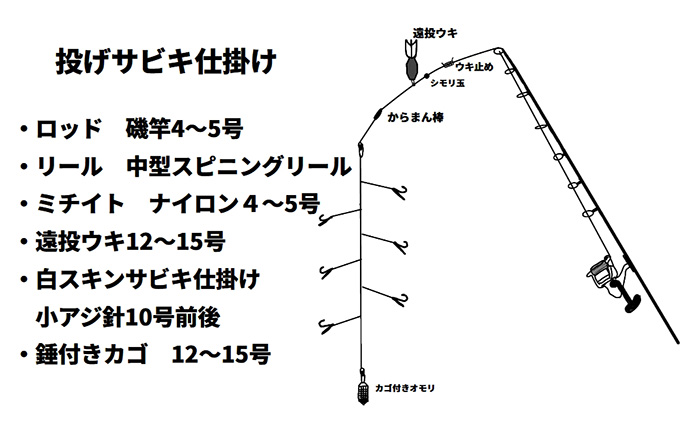 コマセを巻いてその場所に群れを足止めする投げサビキ釣り・カゴ釣りとは違い、変化のあるポイントを重点的に攻めるといった組み立て方になります。
