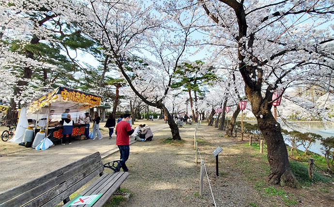 高田城址公園の桜満開が目安(提供:TSURINEWSライター・ハマゴウ)その後、5月のゴールデンウィーク過ぎ位から徐々に釣れなくなり、5月後半~6月頃に観測されている海面水温が目安として18度を超えてくると、尺を超える大アジの産卵が終了し、岸から釣れなくなります。