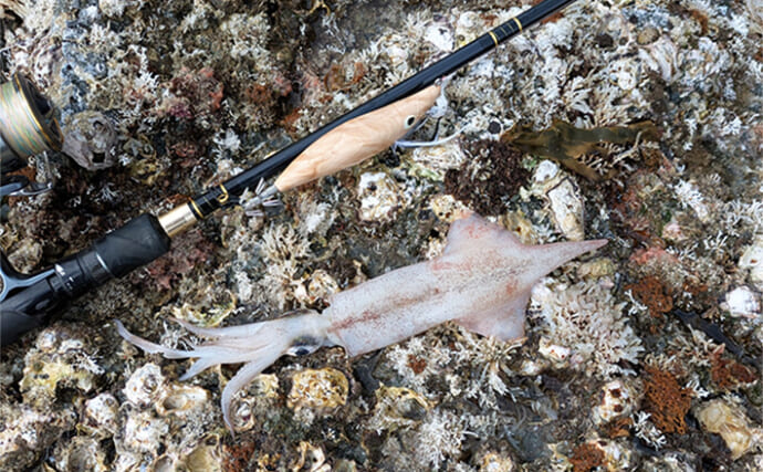 タックルは、7フィート台のエギングロッドに2500番台のスピニングリールです。ラインはPE0.8号、リーダーはフロロカーボン2.5号を使用しました。