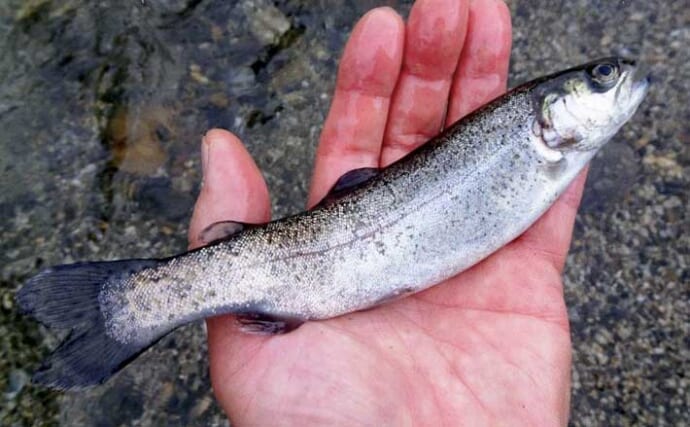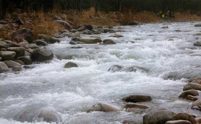 急流が流れる(提供:週刊つりニュース中部版APC・伊藤拓摩)ニジマスの釣果は19~21cm5匹だったが楽しめた。これから雪解けが進み全域でサオが出せるようになると渓流本番だ。