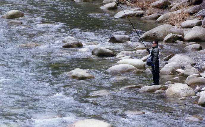 滋賀県東近江市を流れる奥永源寺漁協管内の愛知川は、積雪のため1週間遅れて3月8日に渓流釣りが解禁した。そこで解禁から5日目の12日、成魚放流された残りニジマスを狙ってみた。