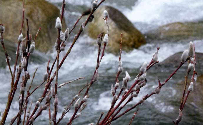 ネコヤナギ(提供:週刊つりニュース中部版APC・伊藤拓摩)何気なく石と石の間に仕掛けを入れると目印が震えた。サオを立てるとグイグイ引きが伝わって2匹目をゲット。こんな所に潜んでいたのか。小雨がシトシトと降りだしたが、ミミズエサで石の間を集中的に攻めると連発して気分は最高。