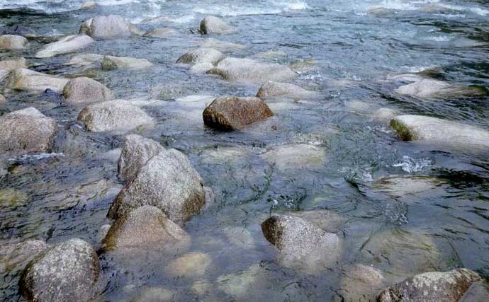 アタリが遠のくと、どんどん釣り上がっていく。ゴロゴロと不規則に並んだ大小の石を、ザーザーと白泡を立てながら乗り越えている急流は仕掛けが入らないので移動する。最後に石裏を粘って釣ってニジマスをゲット。午後4時すぎにサオを納めた。