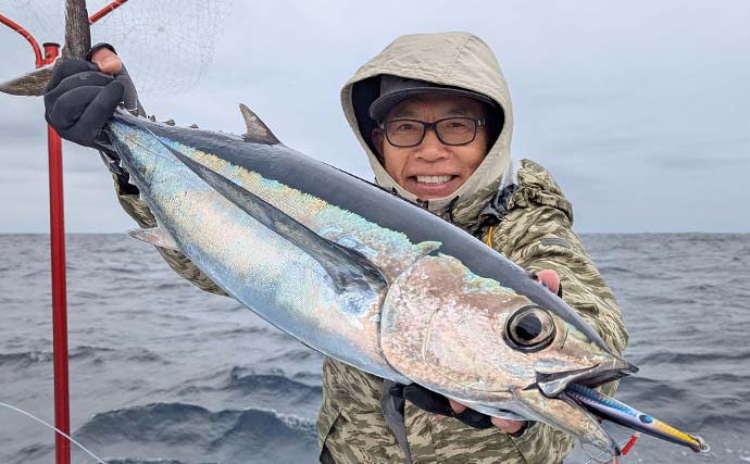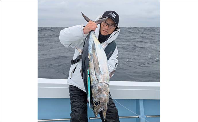 ミヨシのアングラーはトンジギ初心者だったらしく、取り込み寸前にサオを強く立てた瞬間、リールシート上部で折れ、ジグから穂先までロスト。残念だったが、これも経験だ。しかし、彼はこの後、再びヒットさせ、今度はスピニングタックルで11kgクラスを見事取り込んだ。