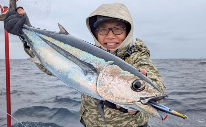 ミヨシのアングラーはトンジギ初心者だったらしく、取り込み寸前にサオを強く立てた瞬間、リールシート上部で折れ、ジグから穂先までロスト。残念だったが、これも経験だ。しかし、彼はこの後、再びヒットさせ、今度はスピニングタックルで11kgクラスを見事取り込んだ。