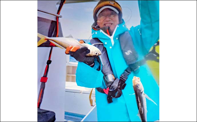熊谷さんにアジ(提供:週刊つりニュース関東版APC・間宮隆)さらに、右舷側では古田良子さんとご主人、渡辺さんと入れ食いモードに突入。