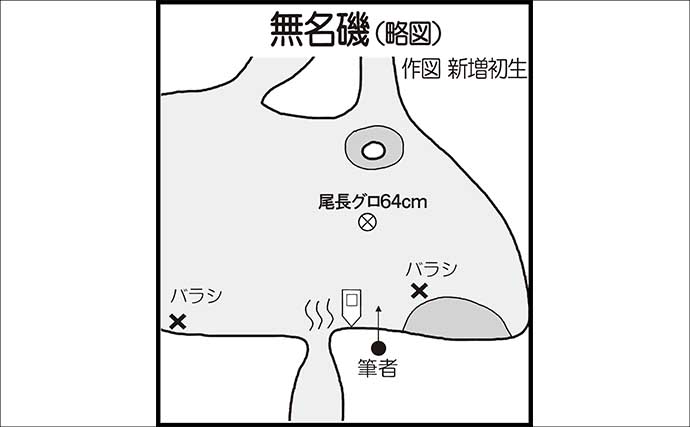 ポイント概況(提供:週刊つりニュース西部版APC・新増初生)寄ってきた魚は海底めがけて素早く潜る。サオは満月のままトップから2段目までが海中に引きずり込まれる。「ヤバイ、やられる」とっさにリールのレバーブレーキを緩めて最小限のミチイトを送りだしながら泳ぐ魚の頭の方向にサオを倒す。サオ尻をお腹に当てて絞り上げる。折れそうだ、何回も突っ込む。
