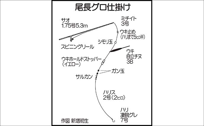 尾長グロ狙いの仕掛け(作図:週刊つりニュース西部版APC・新増初生)ウキがミチイトを遡り、アタリはでないが、つけエサはなくなる。魚はいる。ミチイトを張り気味にしているとバチンとミチイトをひったくられる体感ショックで瞬殺。魚に先手を取られて釣り人が後手に回り負ける。
