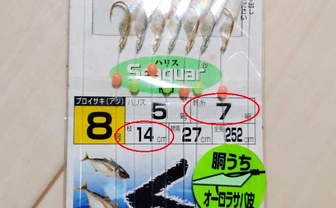 サビキ仕掛けのエダス・幹イト表記(提供:TSURINEWSライター荻野祐樹)ショックリーダー