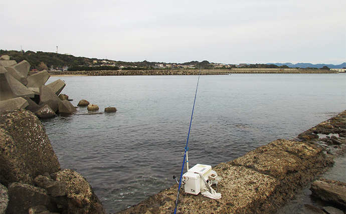 今年は例年に比べ、冬場の水温が2℃近く低いようで、近くのテトラで穴釣りをしている人がガシラを釣っているほかは、磯を見渡してもウキ釣りでグレやチヌを狙うアングラーもほとんど見えない。