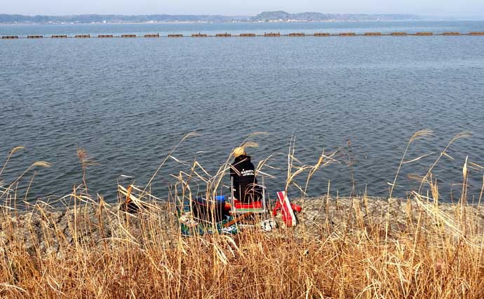 大海原のような霞ヶ浦を前にすると14尺竿はまるで爪楊枝のごとく短く感じるが、何のためらいもなく竿を継ぐ山﨑氏を見るとこの長さでも十分なのだろう。