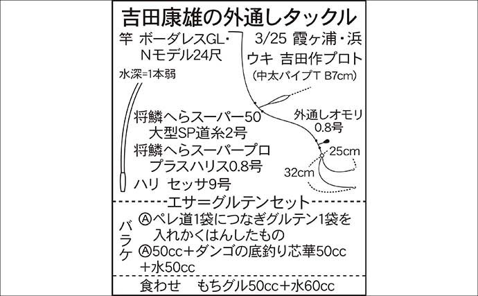 テーマは「春の霞ヶ浦でエンジョイ」。無事に狙いのポイントに入れた吉田。釣り方は竿24尺外通しだが、エサは両グルテンではなくグルテンセットだと言う。真意を問うと「使ってみたい」だと。