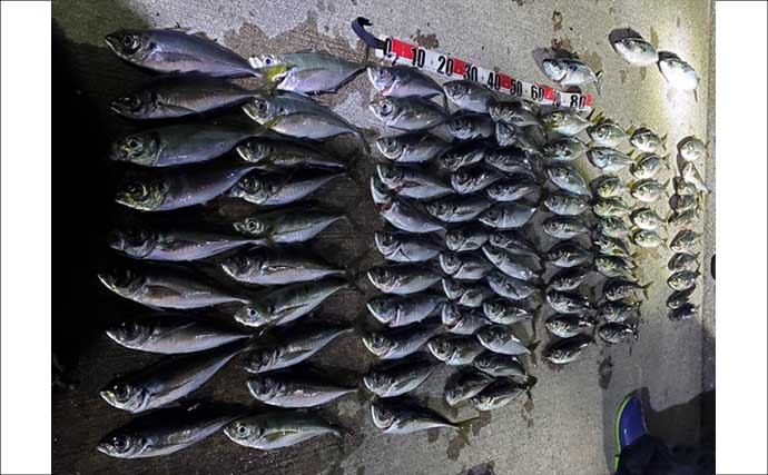富山県・新湊港のSeaEarthでは24日、YOFUKASHI便で出船。ホタルイカパターンで大アジが入れ食いタイムが延長に次ぐ延長。30〜40cmの良型アジが船中90匹オーバー。