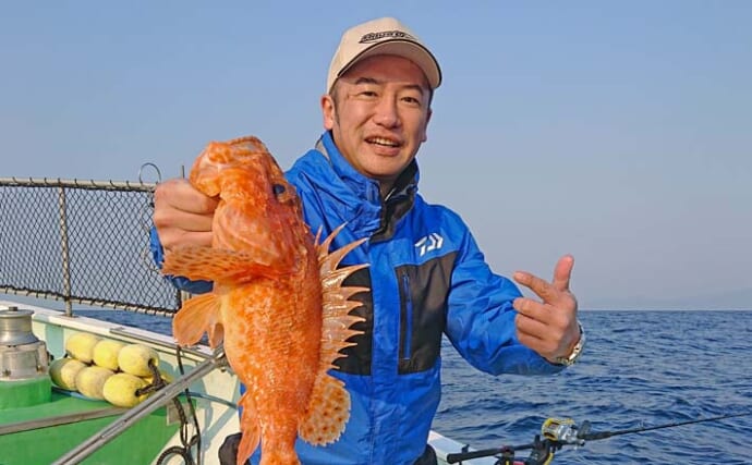 筆者に1匹目のオニカサゴ(提供:週刊つりニュース中部版APC・桑原一幸)良型オニカサゴがヒット