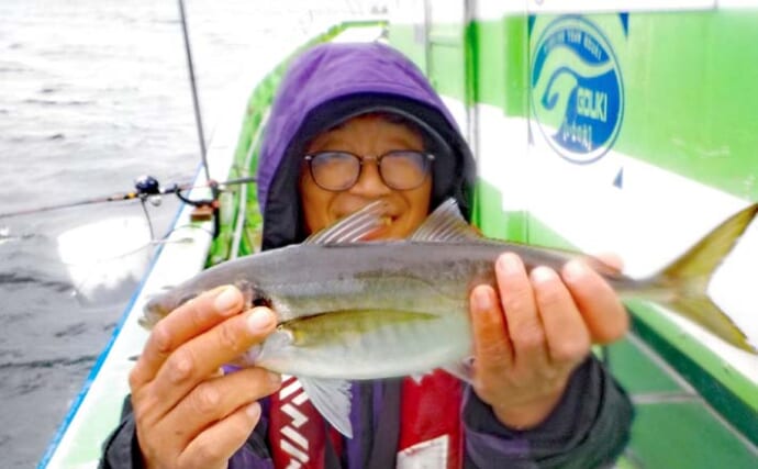 「ここ最近、何度かアジ船に乗っていますが、今年は例年に比べると海水温がかなり低いので、いい日と悪い日があって。朝イチの状況では、悪い日に当たっちゃったかなぁと諦めかけていましたが、潮が緩みだしてくるとアタリが活発にでるようになってひと安心です」と、良型を連続ヒット。