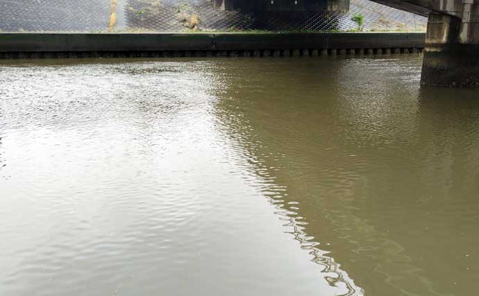 濁りが強かった(提供:TSURINEWSライター宮坂剛志)水色は透明度ゼロの茶色だが、ベイト(ハク)が水面でザワザワしていて、ときおり大きな捕食音まで聞こえる。早い流れもあって、これは思っていた以上に状態は良い。バイブレーション(5g)を流れに乗せて引いてくる。暗い部分を重点的に狙うが、シーバスからのアタリはない。そして突然足元で大きめのボイルが始まり、チャンス到来。
