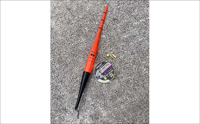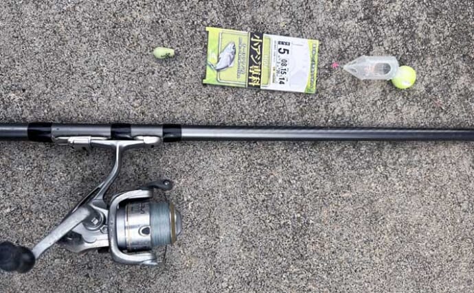 いつもサビキ釣りで使っている磯竿に、フロートの付いたカゴをサビキ仕掛けの上側にセットし一番下に水深に合わせてナス型オモリをセットするだけの簡単な仕掛けになります。ほぼ足元サビキと変わらない仕掛けで簡単に沖を攻めることができます。